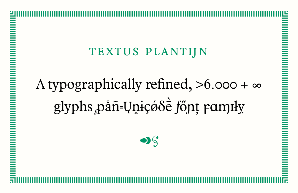 In 2007 I graduated in typography at the Museum Plantin Moretus, Antwerp, summa cum laude. Meanwhile I did a PhD in Art History (dissertation) — my primary literature (18th century art theory) was almost all in 𝕱𝖗𝖆𝖐𝖙𝖚𝖗, and I loved it, way more than the metaphysics of the texts. Next, I did a post-doc in Computational Linguistics, but rather indulged in digitizing medieval paleography. I continued freelancing as a book and graphic designer with my one-man graphic design studio Rhythmus.be. From 2009 to 2013 I was a lecturer of typography; it were my happiest years, teaching my passion for type to equally enthusiastic students. Sadly, higher education politics kicked me out of academia. From 2013 on, I have been working on Textus, converting my expertise and know-how into software for typographic automation. In the autumn of 2016 I allowed myself a sabbatical leave to set up one of my major side projects, which combines my love for (dead) languages and keen eye for typography: Dodecaglotta, the Polyglot Bible Typography Project and its Pan-Unicode font family Plantijn.